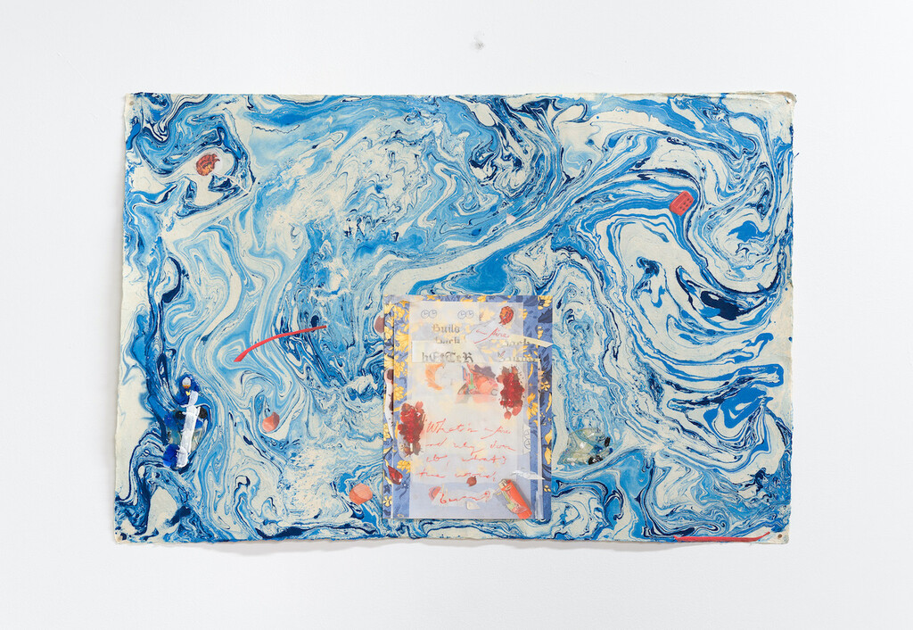 Build Back Better blue, 2021, collage and acrylic on marbled paper with Swarovski crystals, dimensions variable
