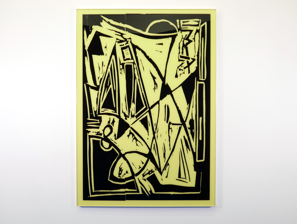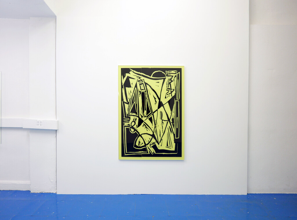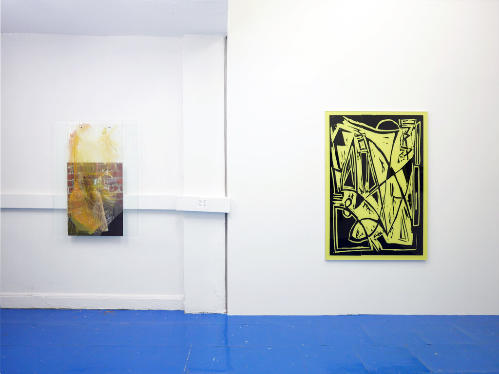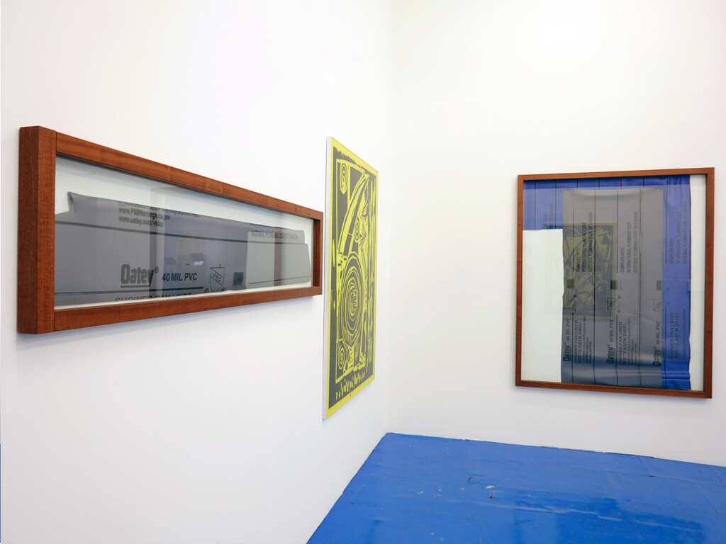 the show of Andy Meerow and Rose Marcus, two friends in conversation. The pieces are as follows: Andy has taken photos of some small woodcuts of swirls and 90s world market looking signifiers, which were hanging in his therapist’s office. He blew them up, transferred the images into high contrast vinyl decals mounted on plexiglass, and painted a sickly yellow behind them. Rose has hand-made high-end mahogany frames and they are sitting around and a little on top of roughly cut shower liners which display a government health warning in a sensible font. These liners are stapled directly to the wall.