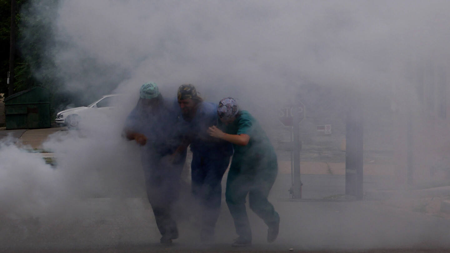 Shot in Kansas City, Missouri, in newly built homes left vacant and unfinished in the economic crash, Don’t Go Back to Sleep follows roving groups of medical professionals, frontline emergency workers adrift in nearly empty, end-times urban and suburban landscapes. In a series of uncanny scenes, dark joking emerges alongside efforts at cohesion and collectivity. Squatting never lived-in suburban developments and luxury high-rises, depressed with the aura of so many displaced by the housing market catastrophe, nurses and doctors establish make-shift triage centers within the architectural mundane: fixtures and countertops, carpet pads and exposed wiring, fireplaces and crown molding. Untouched appliances glow dully in the market’s wake. Time alternately slows and speeds as the characters recalibrate their stress responses, suspended in the in-between of waiting, activated by uncertainty, disasters already underway and the reverberations of decades of distress. Alcohol, cake and lunchmeat provide unstable sustenance as the workers labor, sleep and bury their dead.