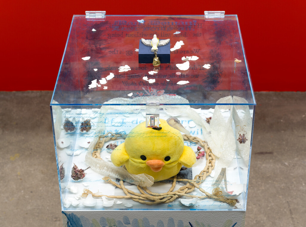 The Unfunny Yellow Bird, feat. omens, 2021, egg tempera, gouache, charcoal, and primer on wood; drypoint on Plexiglas, book snakes, eggshells, snakeskin, epoxy, dried cherry blossoms, wax, graphite, Kiiroitori San-X Original Plush, and charm, 45 x 13 x 13 inches
