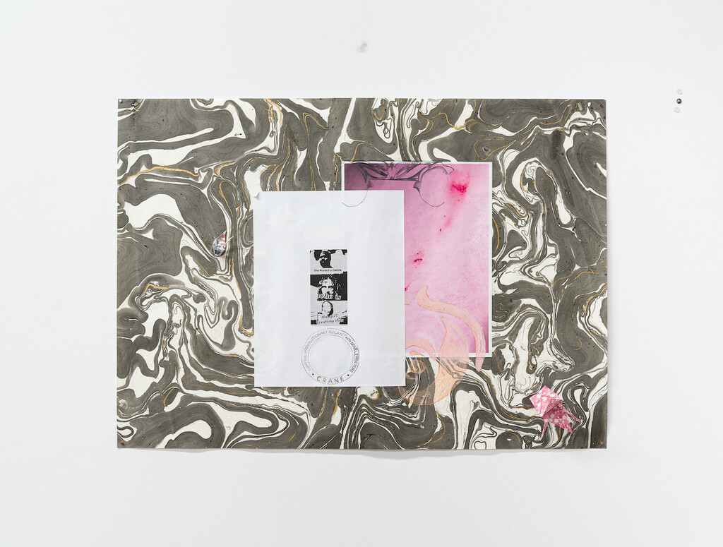 She works for DARPA..., 2021, collage, graphite, acrylic, and oil pastel on marbled paper with Swarovski crystals, dimensions variable