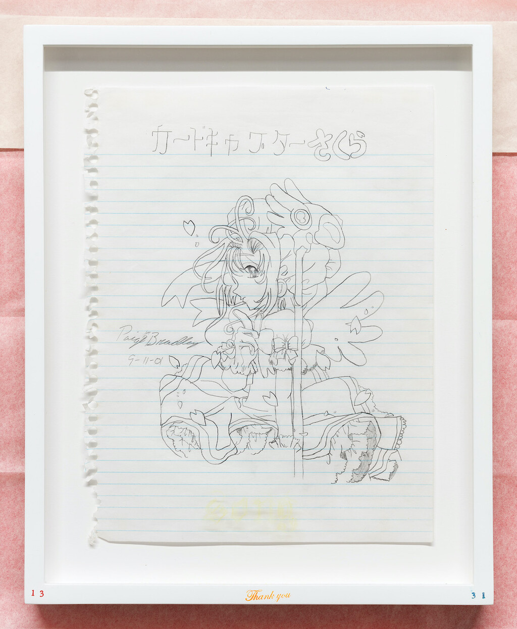 Let's, Say, Sing it Again (detail), 2022, found drawing in pencil on paper, framed, ink, pencil, tissue paper, colored pencil, Pantone 19-1664 TCX True Red swatch card, and foil paper with Wedgwood ashtray and ashes, dimensions variable
