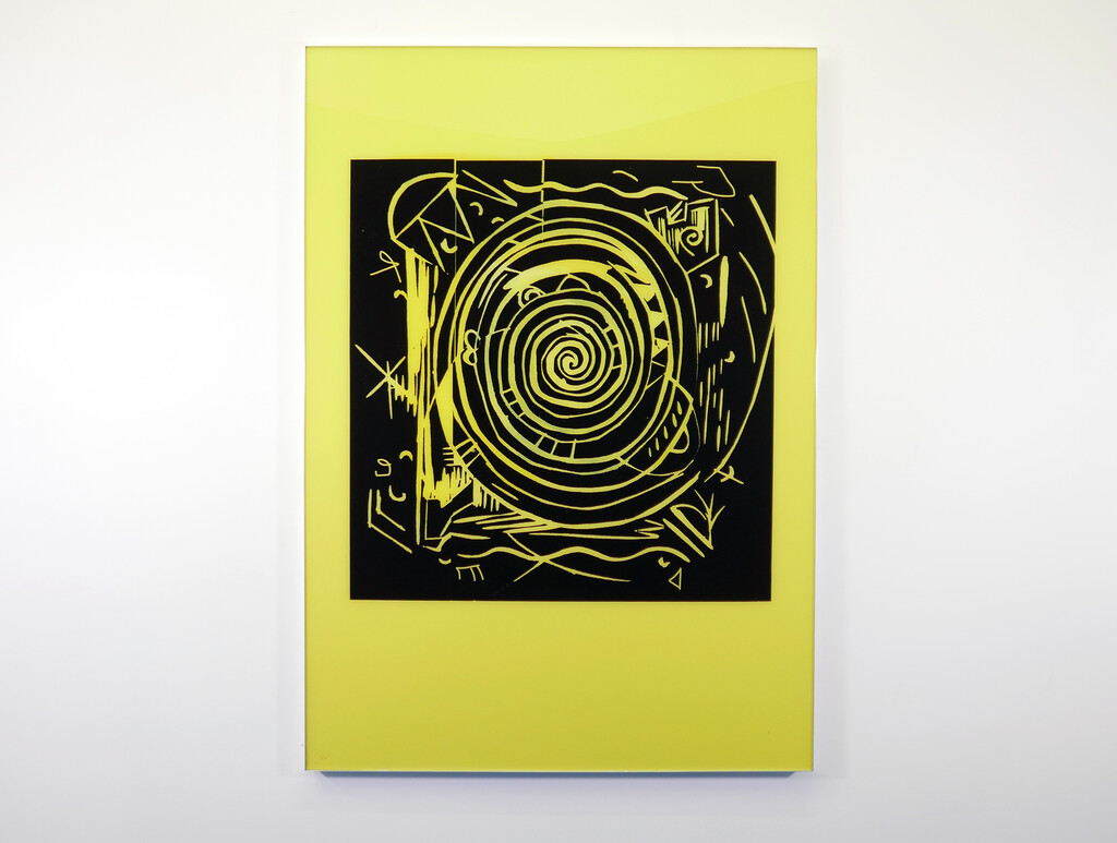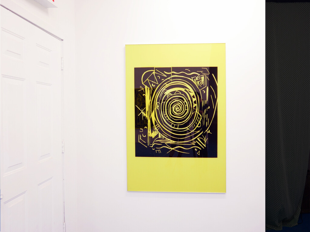 the show of Andy Meerow and Rose Marcus, two friends in conversation. The pieces are as follows: Andy has taken photos of some small woodcuts of swirls and 90s world market looking signifiers, which were hanging in his therapist’s office. He blew them up, transferred the images into high contrast vinyl decals mounted on plexiglass, and painted a sickly yellow behind them. Rose has hand-made high-end mahogany frames and they are sitting around and a little on top of roughly cut shower liners which display a government health warning in a sensible font. These liners are stapled directly to the wall.